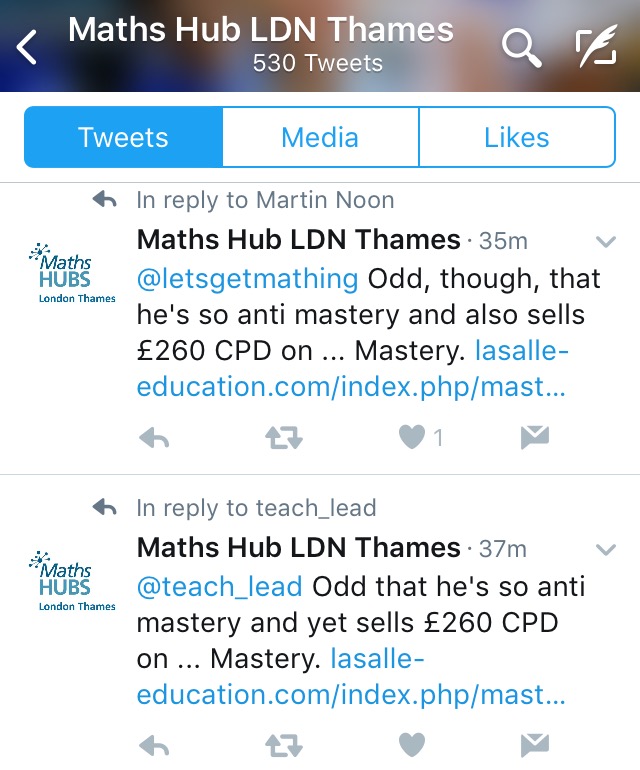 I only spotted the Tweet because David responded to say he did not see any hypocrisy in my writing a blog promoting mastery and also selling mastery CPD. David kindly included me in the thread, so I was made aware of the Maths Hub LDN Thames statement. David is the most non-partisan, balanced, objective person I have ever met in the education world. I would suggest his judgement is sound.
